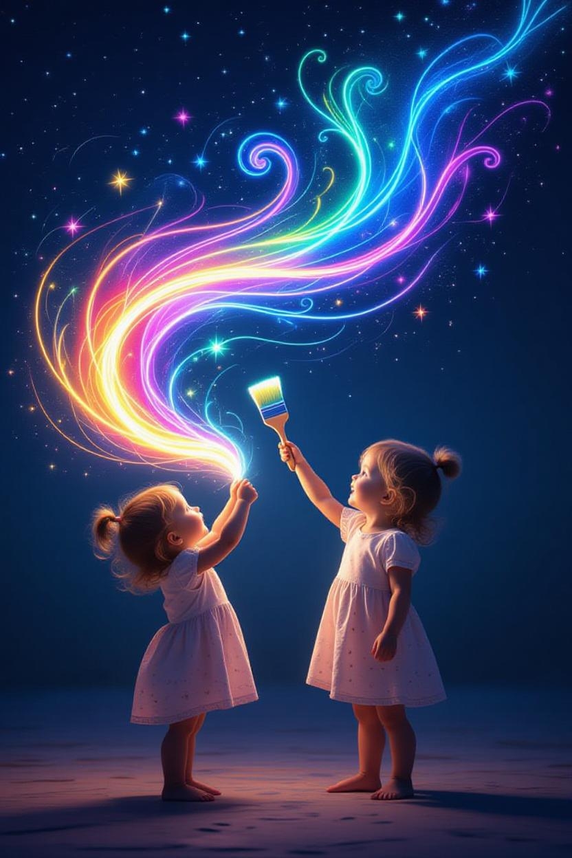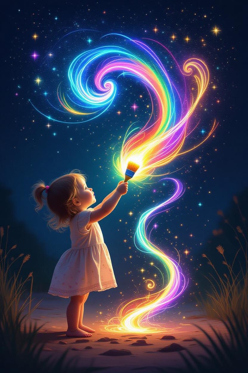 In her tiny hands, she cradles a paintbrush, not of ordinary make, but one that hums with a celestial song. With each graceful stroke, vibrant streams of light burst forth—rainbow hues of crimson, sapphire, emerald, and gold swirl and spiral into the air like a symphony of colors. These luminous trails twist and twirl, weaving a tapestry of brilliance that illuminates the darkness with a warm, ethereal glow. The brush becomes her wand, conjuring a world where imagination reigns supreme, each stroke a note in a melody only she can hear.